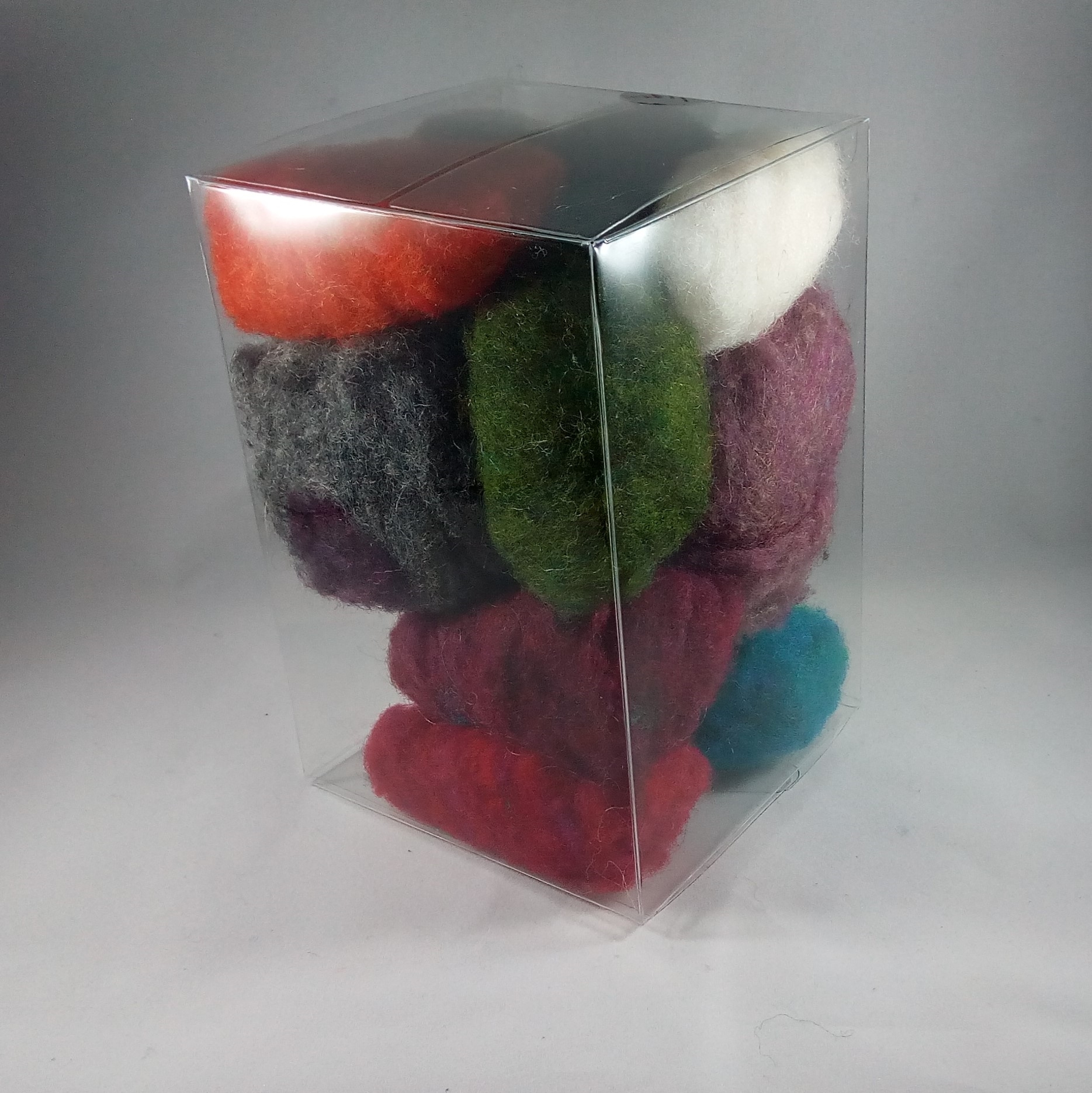 3 oz Box of Surprise Wool Roving. Each box has assorted 100% Merino Wool Roving. Great for your stash of wool.