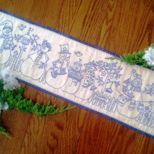 7 Snowmen out in the Yard with Trees, Birds and Birdhouses. Make a super Table Runner or a BIG Bench Pillow for decorating. Embroider your snowmen in a Wintery Blue setting or try a cheerful RedWork version. Stitched on Feather Down Cotton from "Aged to Perfection" collection. Finished with Borders and Prairie Point using Snow Happens Fabrics.